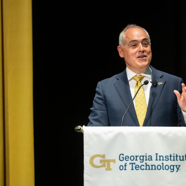 During his 2025 Institute Address in the Walter G. Ehmer Theater, the president revealed that record enrollment, campaign fundraising, and research expenditures have positioned Georgia Tech ahead of schedule on the plan that runs through 2030.